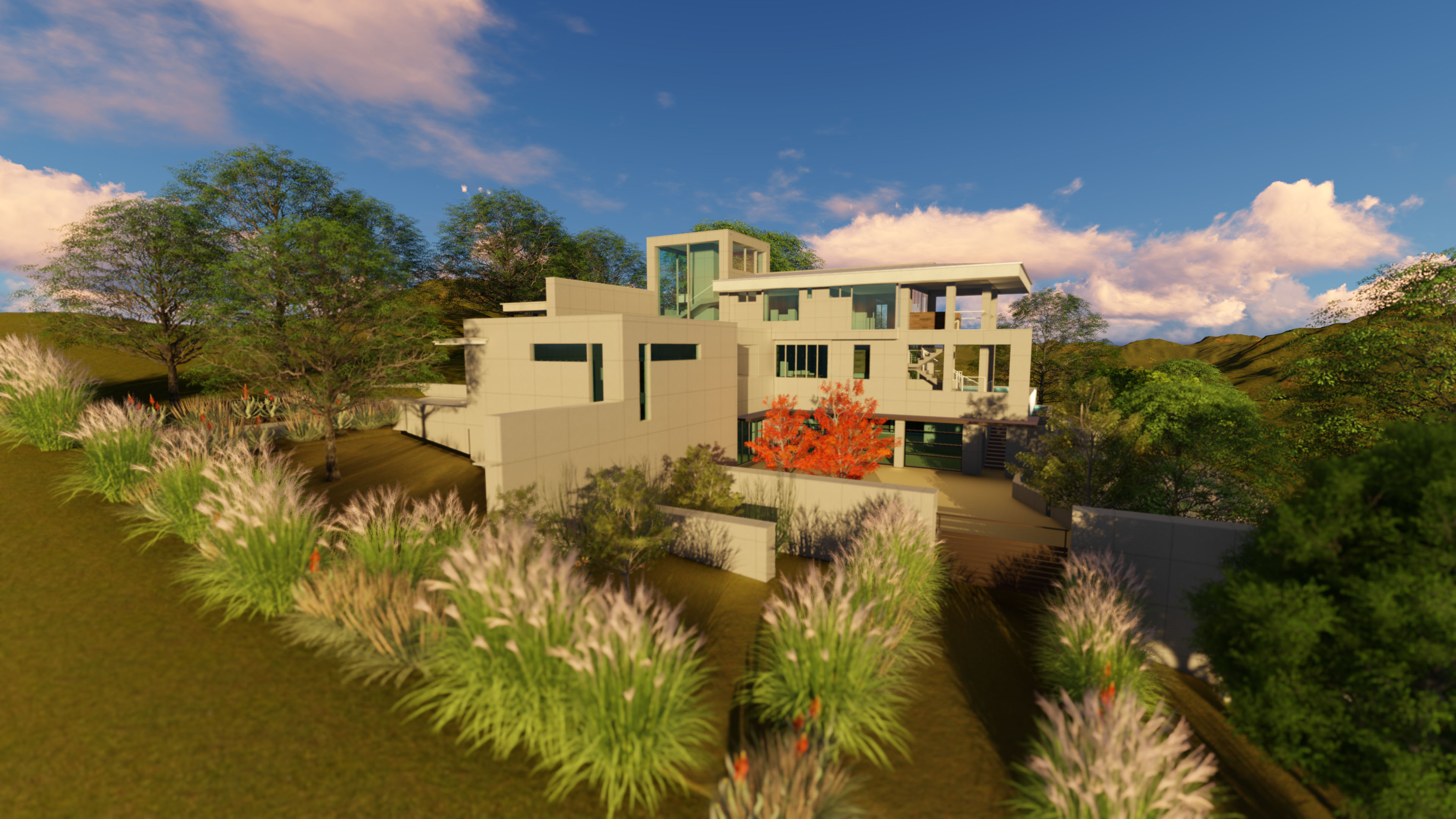 Rotated to the view, the primary organization of the main spaces turn away from the street and open up towards the down slope. Opaque walls contrast to the large glass doors and window panels and play with the solid / void and indoor / outdoor dynamic. Unique features include the surprise of the courtyard, natural light shafts, clerestory windows, elevator to a roof top terrace, and the trampoline terrace above the pool.