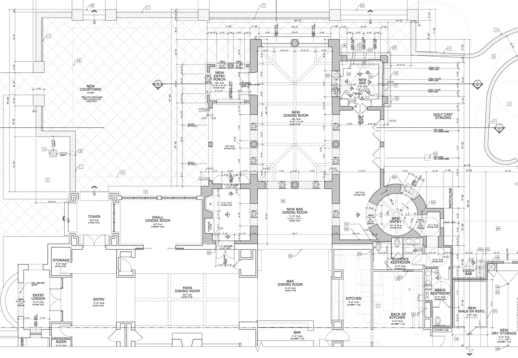 New Clubhouse Addition with comprehensive remodel, renovation, and materials updating to existing private club. New Kitchen, new Bar, new Dining area, new Private Dining, new Retail space and new Restrooms. Exterior courtyard and landscape design were integral to the updated design along with a new golf cart staging area. Native plant materials, sustainable construction techniques, and flexible space planning all come together to form a newly visioned Golf Club. Custom furniture was designed including end-grain mesquite tables locally sourced and fabricated. Specialty custom light fixtures were fabricated to match existing fixtures brought in from San Miguel de Allende, Mexico.