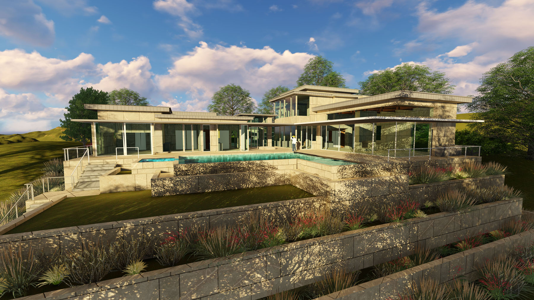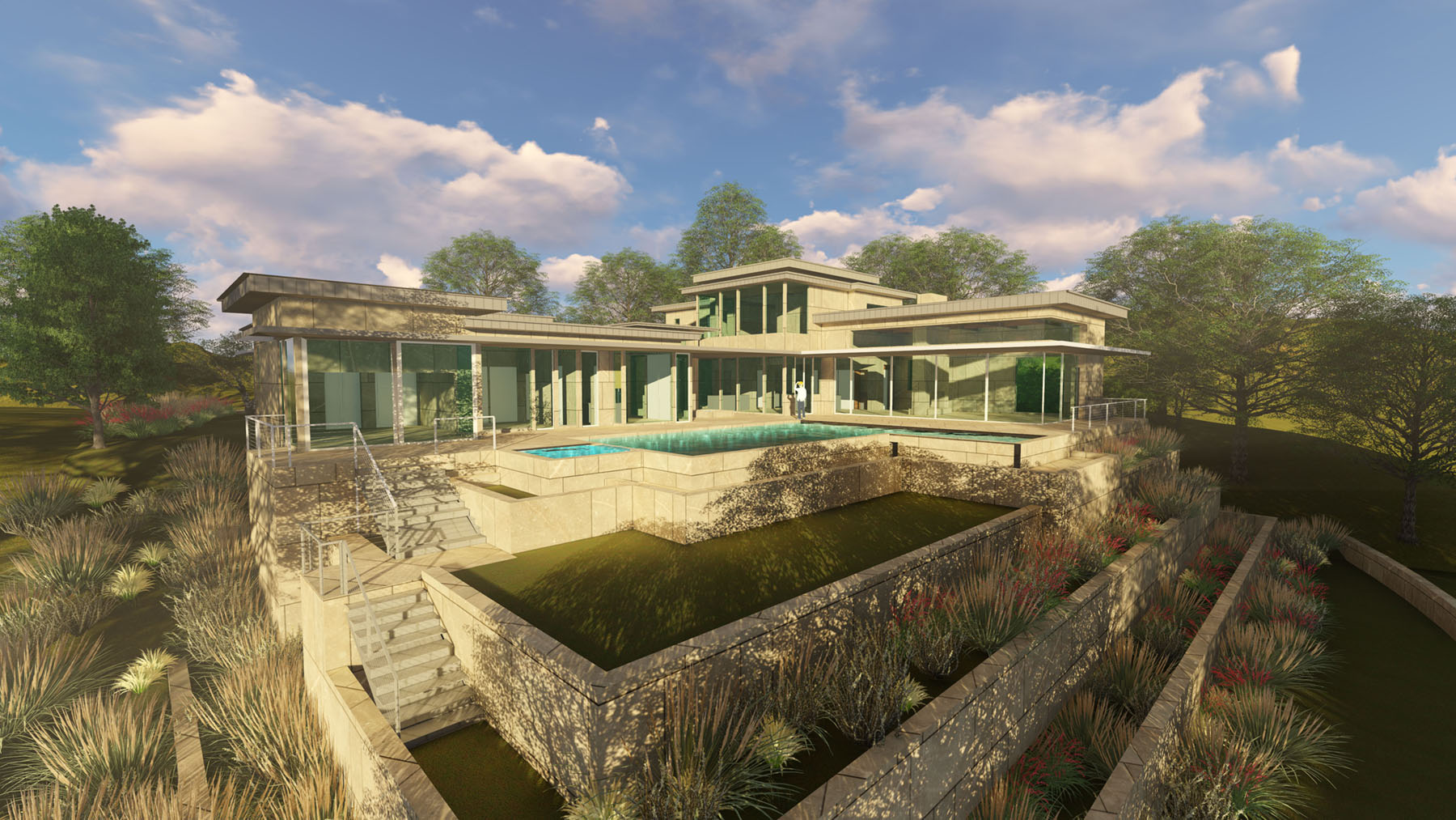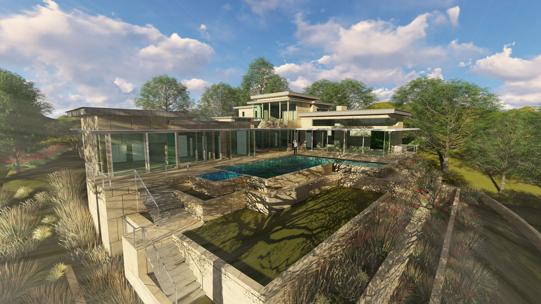 Spectacular views of downtown Austin, and the panoramic Hill Country inform the layout while increasing the exposure of the Architecture. A simple ‘L’ shape form with an intimate Courtyard organize around a Resort style pool, Spa, and Landscape Terraces. Cantilevered roof planes of steel, wood, and plaster shade expansive glass walls and create a floating effect, reinforcing the sloped site. A stone wall creates a gateway into the motor court with multiple garage doors protected from street view. A central glass pavilion acts as the entry point and glass wings separate the public and private zones of the residence. Upscale window and door systems with zero thresholds further the experience of bringing the outdoors into the interior of the home along with the stone flooring that flows all the way to the pool. A respect for Mid-Century Modern style is apparent throughout the project, but re-imagined with current technology, lighting, appliances, and large automated moveable glass walls.