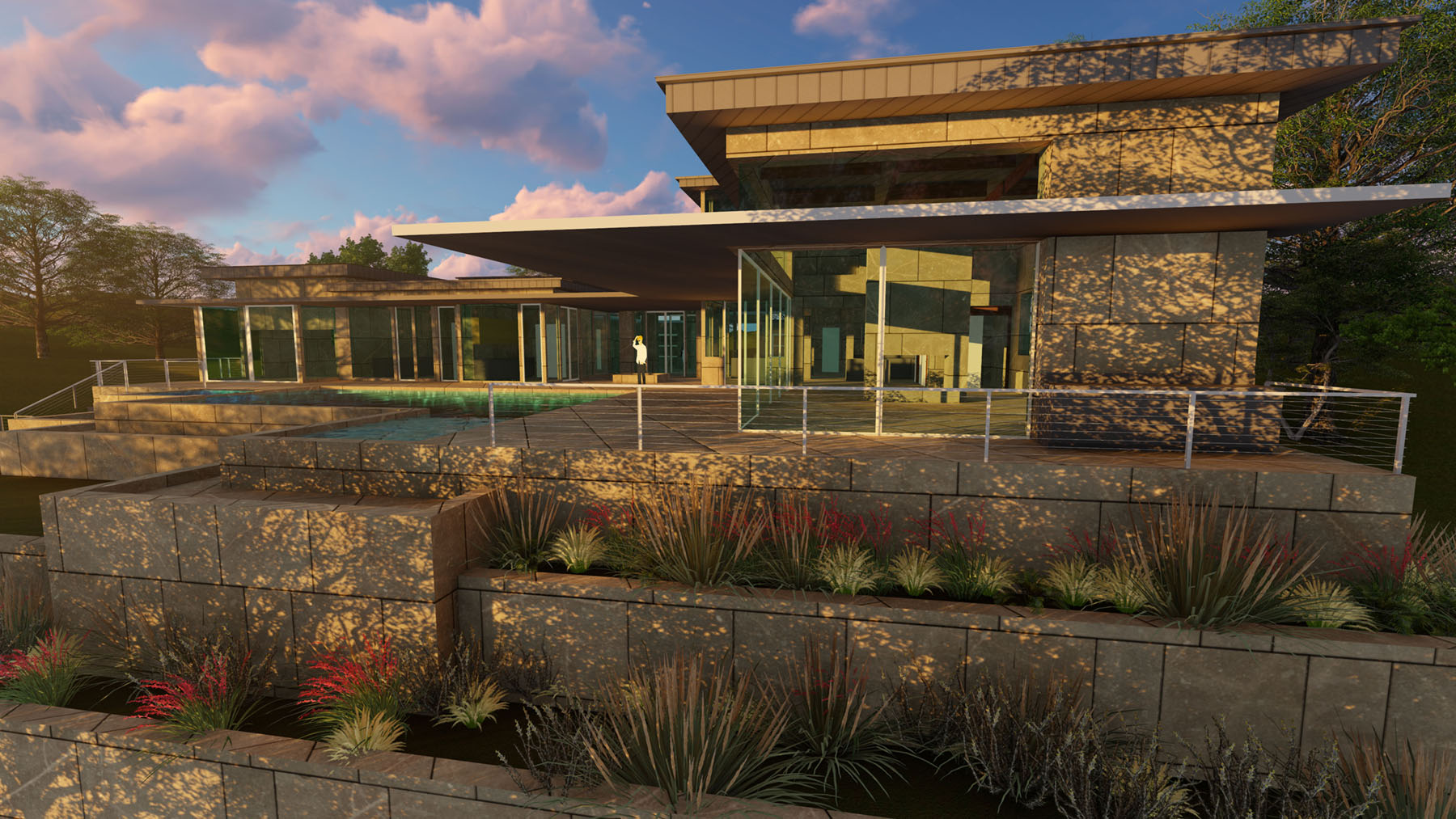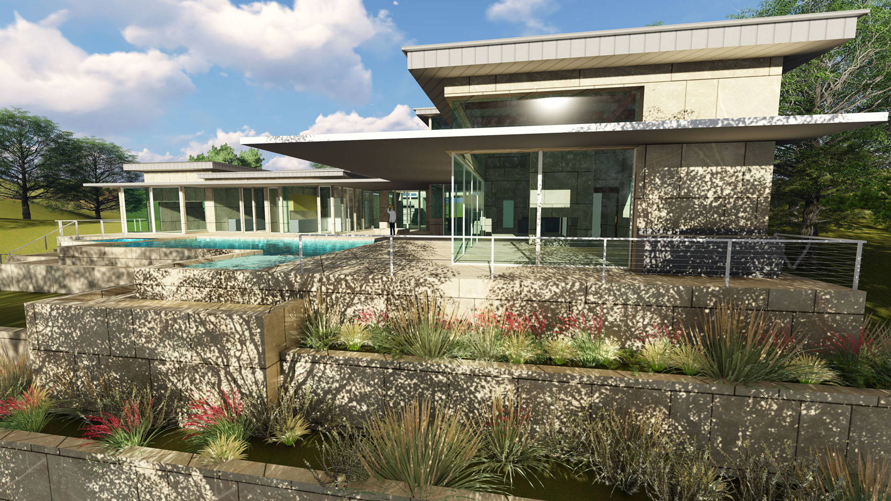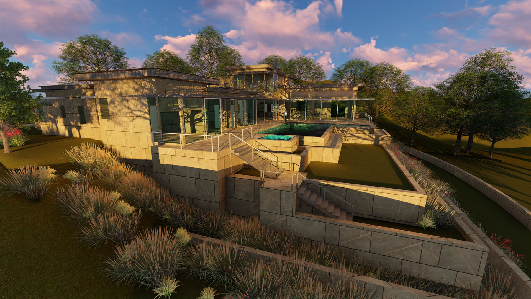 Spectacular views of downtown Austin, and the panoramic Hill Country inform the layout while increasing the exposure of the Architecture. A simple ‘L’ shape form with an intimate Courtyard organize around a Resort style pool, Spa, and Landscape Terraces. Cantilevered roof planes of steel, wood, and plaster shade expansive glass walls and create a floating effect, reinforcing the sloped site. A stone wall creates a gateway into the motor court with multiple garage doors protected from street view. A central glass pavilion acts as the entry point and glass wings separate the public and private zones of the residence. Upscale window and door systems with zero thresholds further the experience of bringing the outdoors into the interior of the home along with the stone flooring that flows all the way to the pool. A respect for Mid-Century Modern style is apparent throughout the project, but re-imagined with current technology, lighting, appliances, and large automated moveable glass walls.