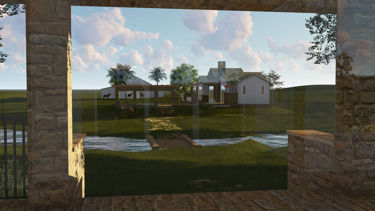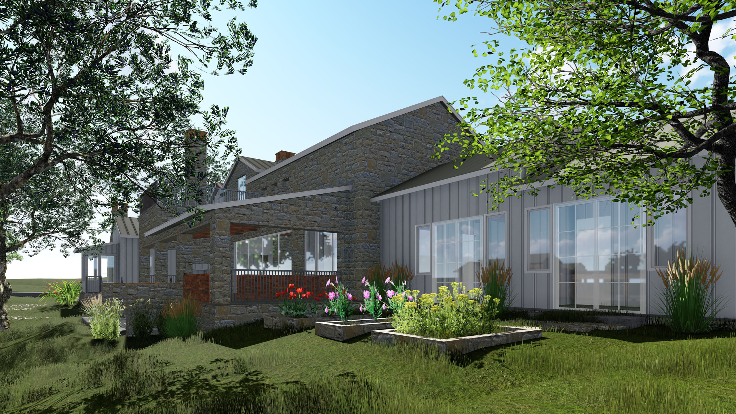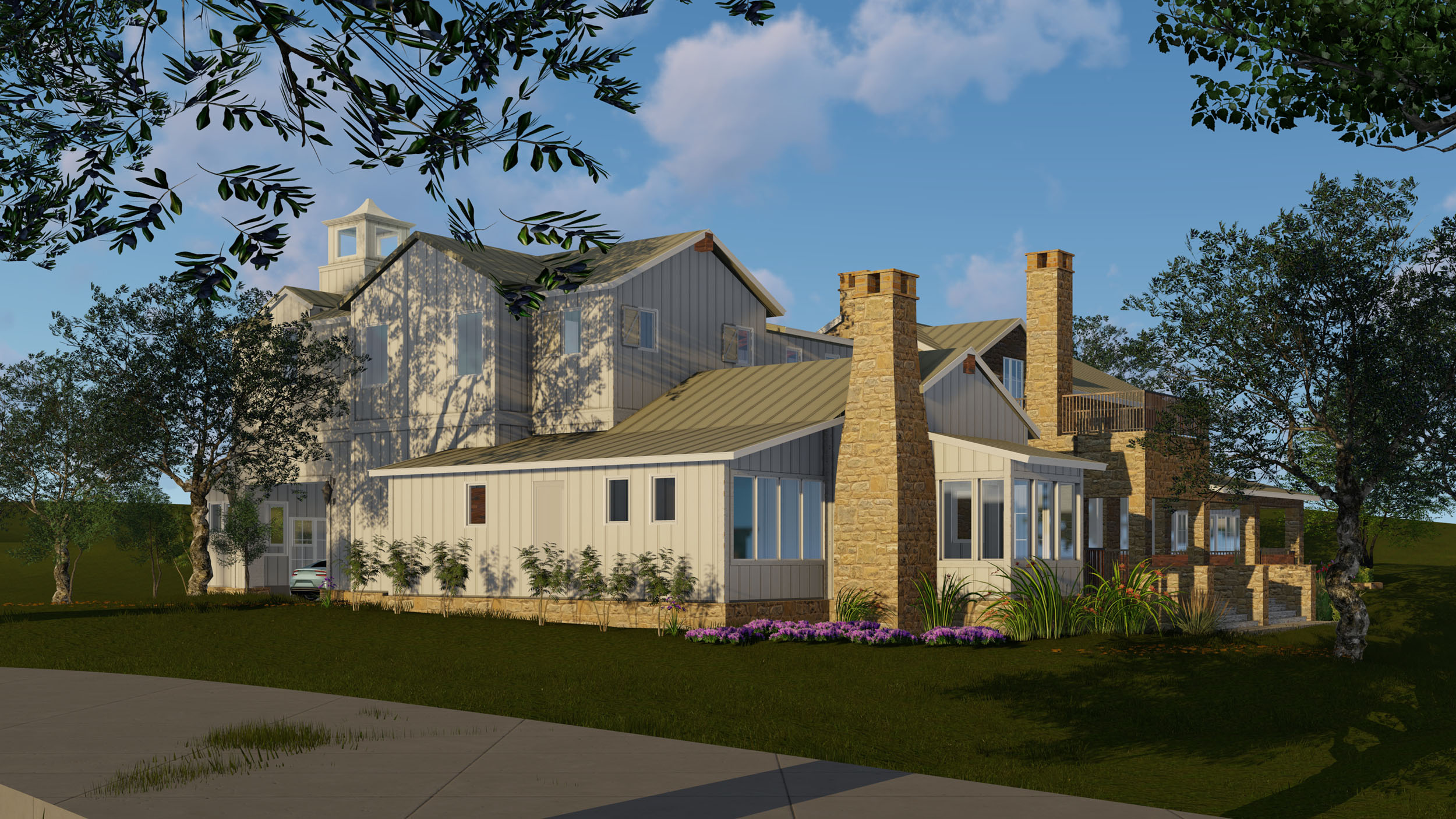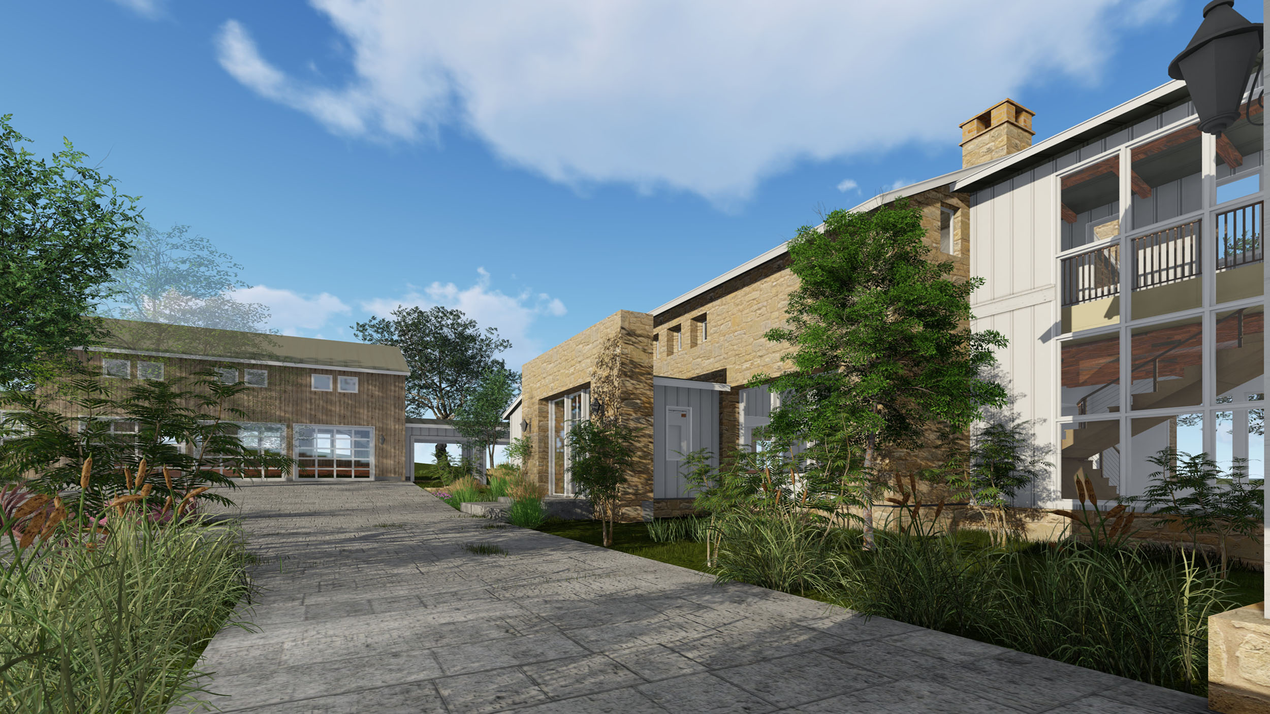 A Classic Texas Ranch House in the hill country, near lakes, golf, and other amenities, this charming estate home consists of several buildings including the Main House, the Guest House / Pool House, and the Barn. The Main House follows the vernacular style of an heirloom family home built over time. It has the masonry structure of the Main House with board and batten auxiliary structures added to the sides and rear. The Main House has a modern Primary Suite along with Guest Suites, a modern Kitchen, Great Room, and large covered outdoor living porches. The second floor has a Bunkhouse and other secondary bedrooms. A Greenhouse, raised planters in the Garden, Bocce Court, and natural amenities across the site give an authenticity not often found in today’s designs. The Pool House, pool, and spa are located across the natural stream in the site line of the Main House with the Barn and Horse corral as the backdrop.
