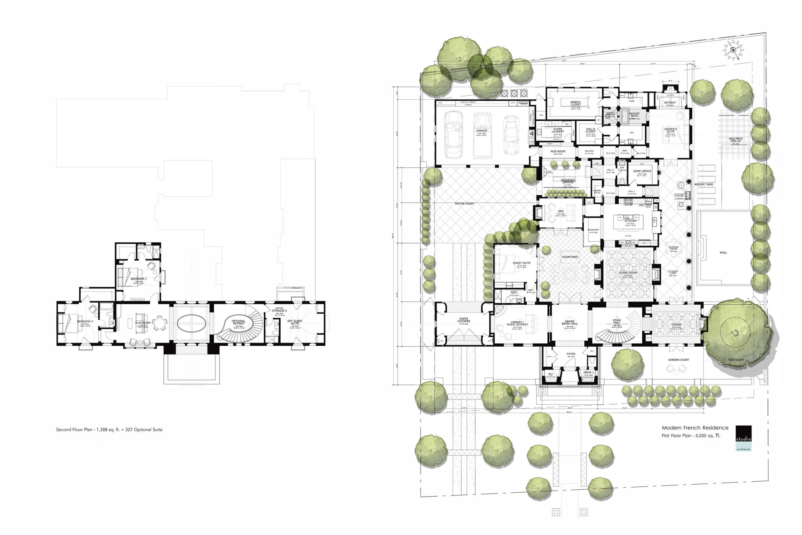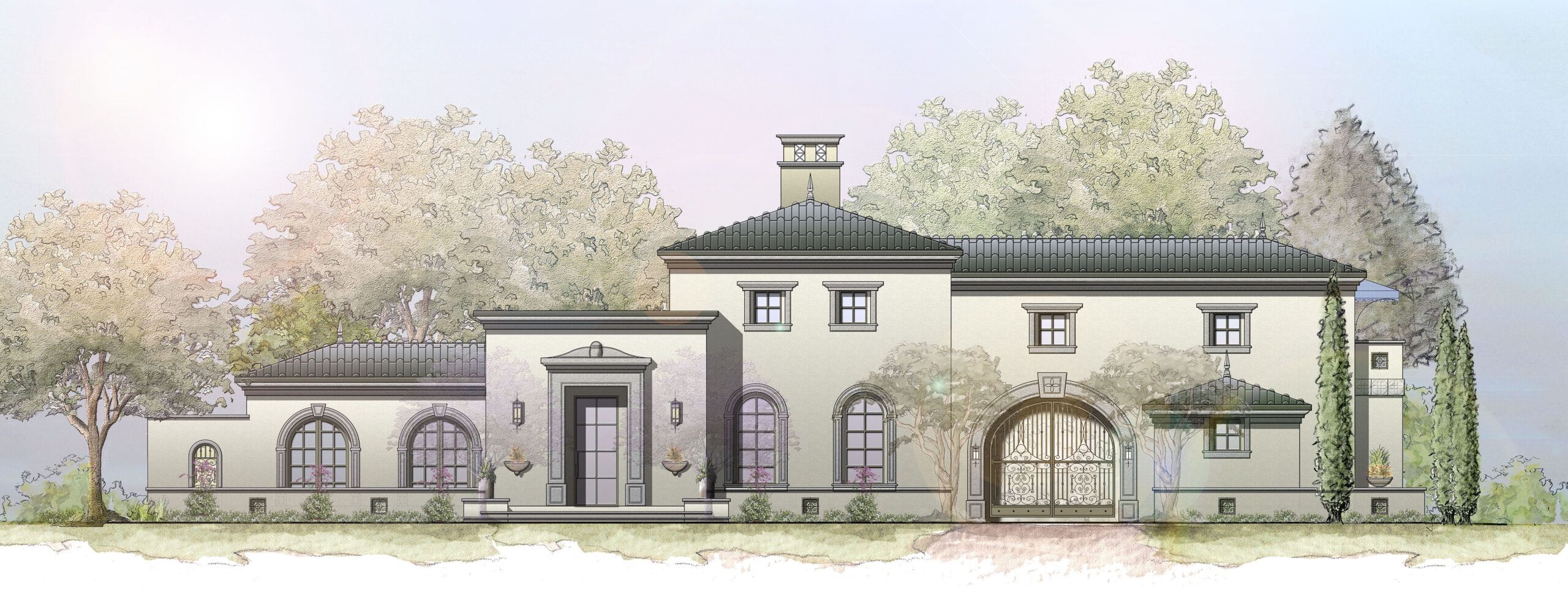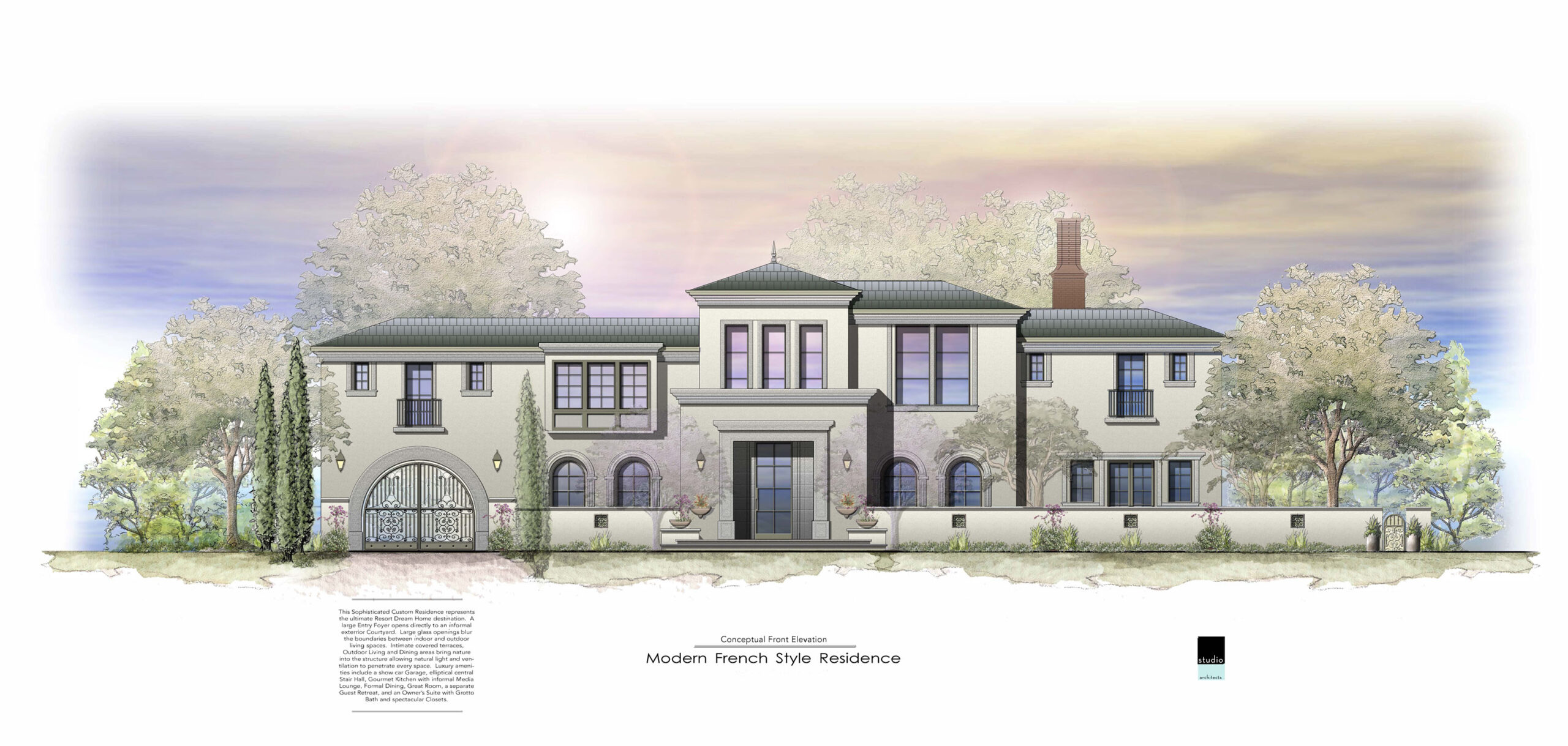 A Modern interpretation of a French Country home designed for a young couple and their children. A private porte-cochere leads to a secluded motor court with garages and extra outdoor space.  An interior courtyard organizes spaces providing natural light and ventilation so that all rooms feel open and connected to the outdoors.  All primary spaces are located on the main level, with secondary bedrooms upstairs. The use of integral color exterior plaster, deep recessed windows and doors, and a slate tile roof complement the French style while the ultra-modern kitchen and resort style bathrooms keep the home up to date.
