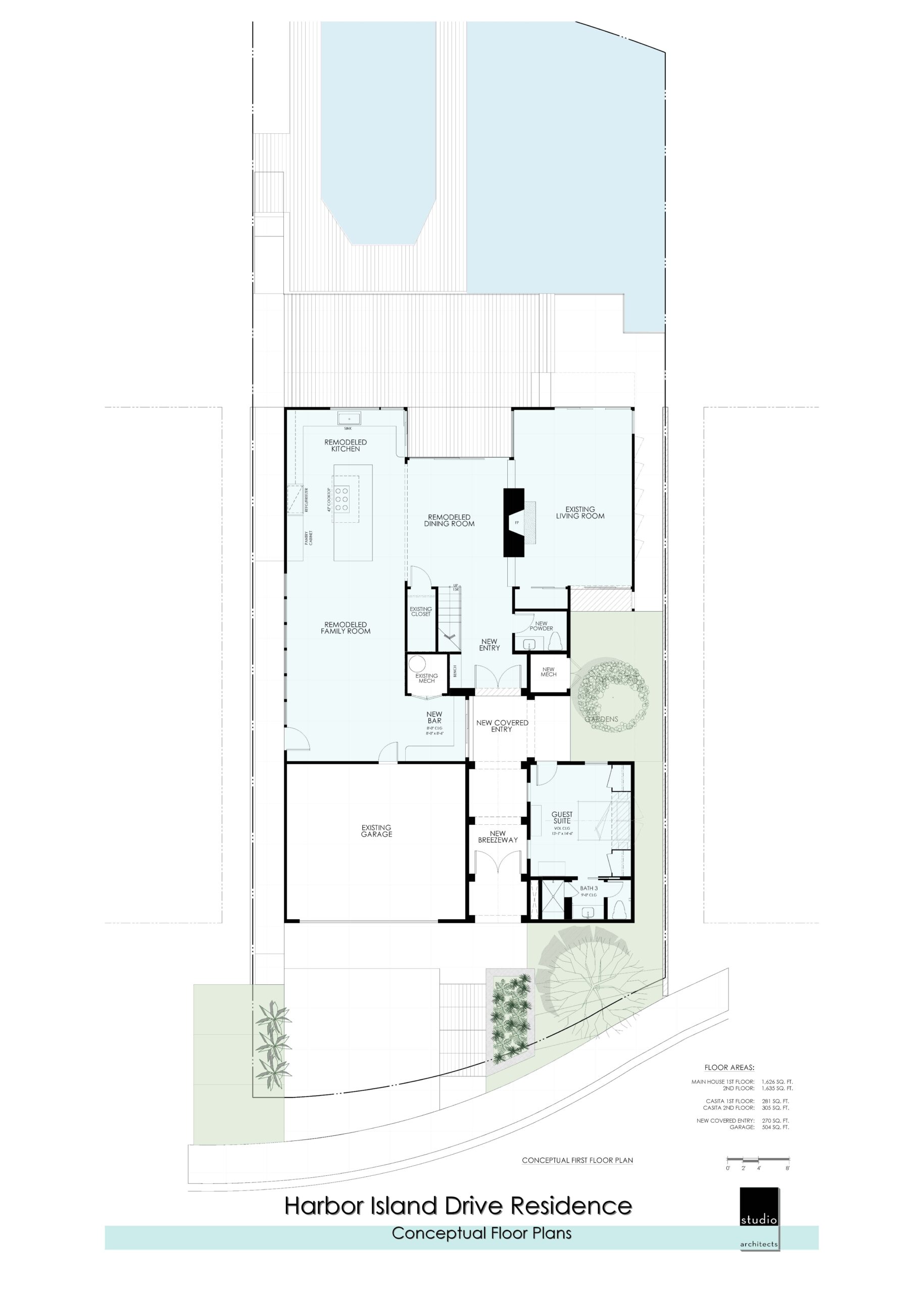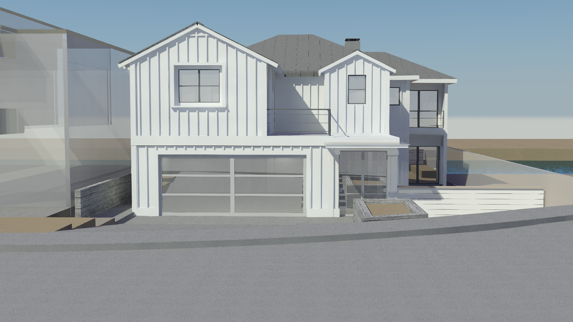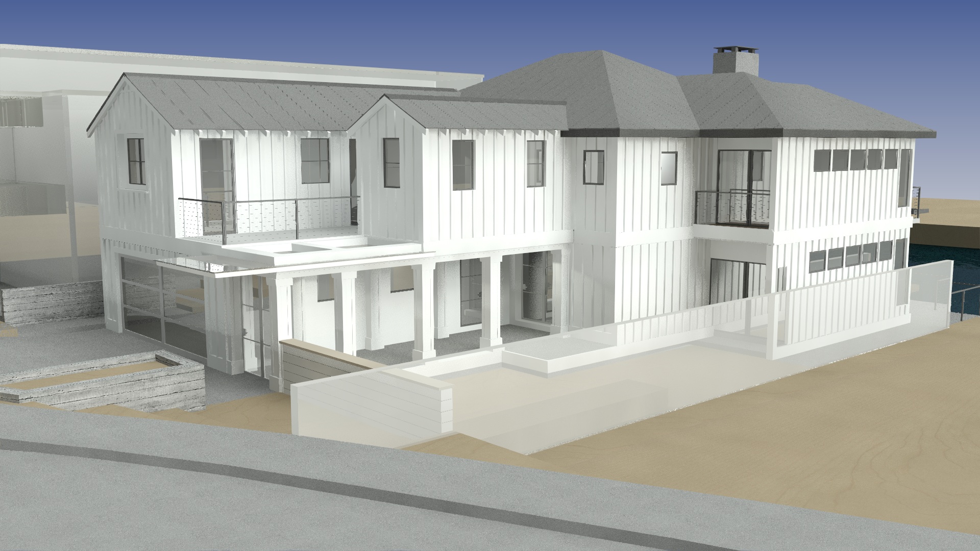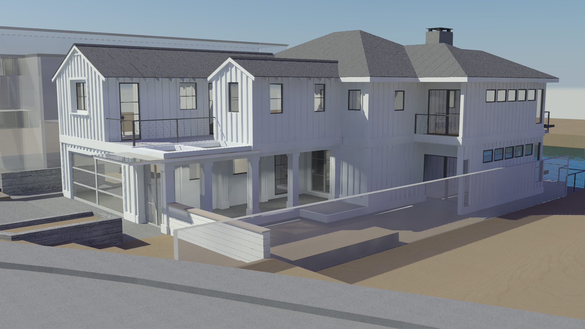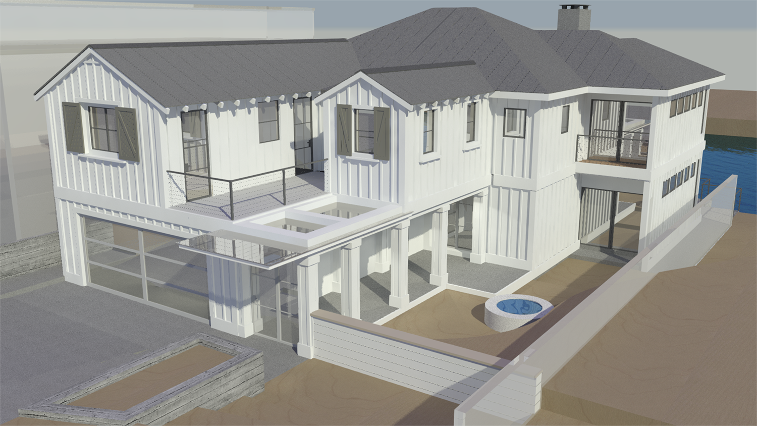 The client asked for a simple, low maintenance, sustainable design to fit a tight bay front lot. The existing guidelines only allowed for a low two-story residence with massing similar to the original structure. Our response was a thoughtful design that emphasized views in both directions towards the water and amplified the indoor / outdoor spatial opportunities. A courtyard towards the front invites guests and family into an informal gathering space that becomes the entrance to this charming family home.