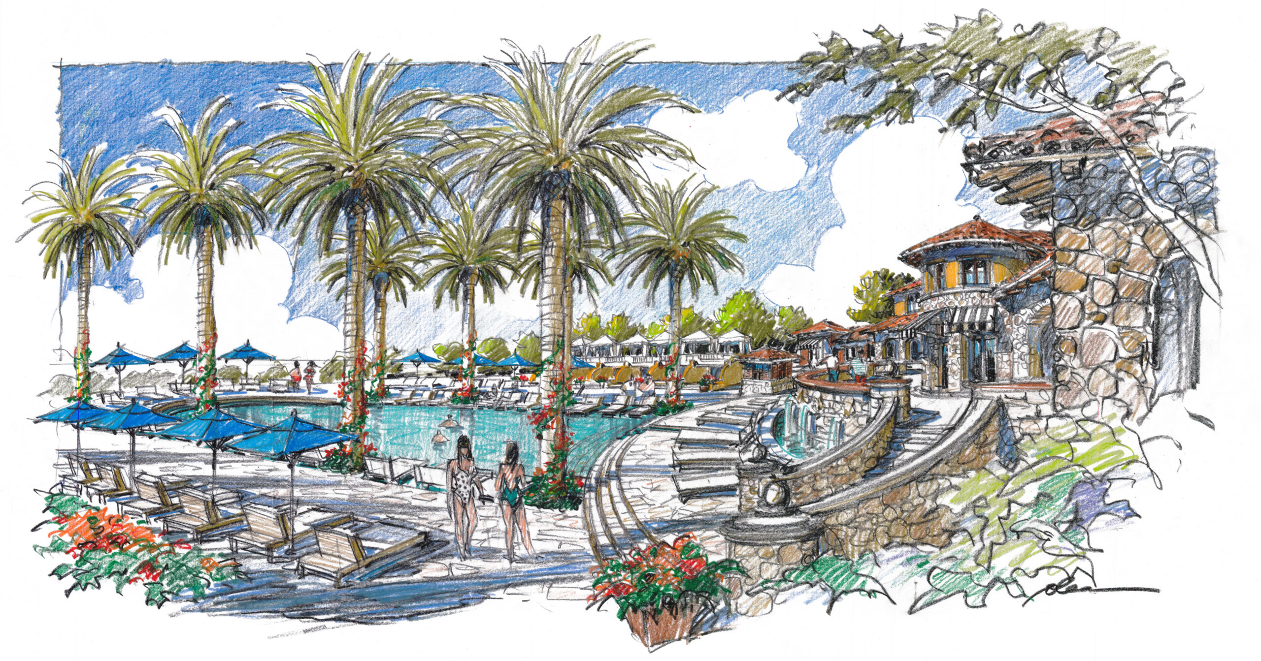 Part of a large-scale land plan with a host of amenities, multiple housing types, equestrian center, swim club, winery, sits at the top of the resort, the Resort Hotel. A small but luxurious hotel is reminiscent of the Spanish Colonial style and Andalucian style adopted by local architects in the prime time of the region. Authentic details, local materials, and sustainable building practices are all planned for this resort.