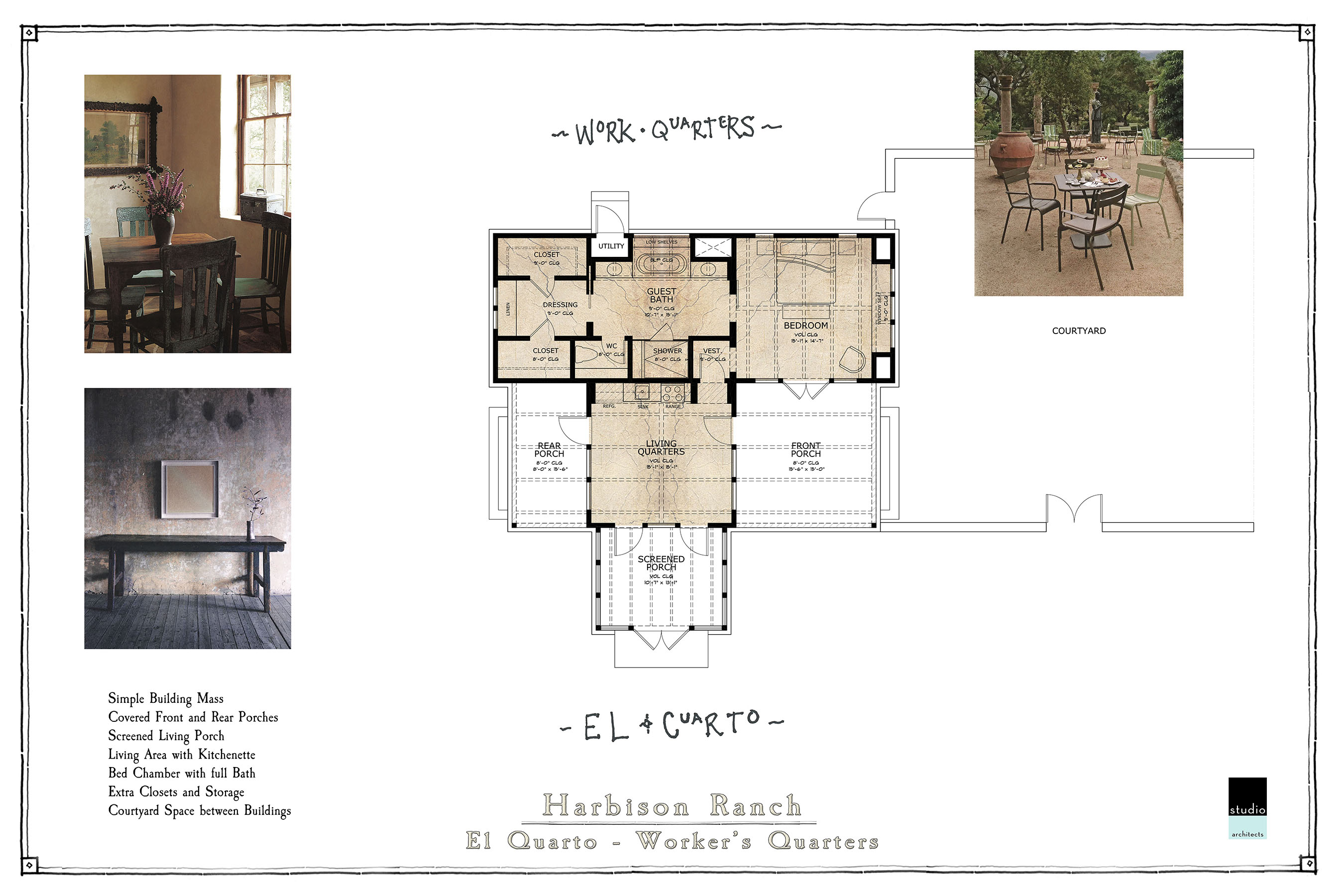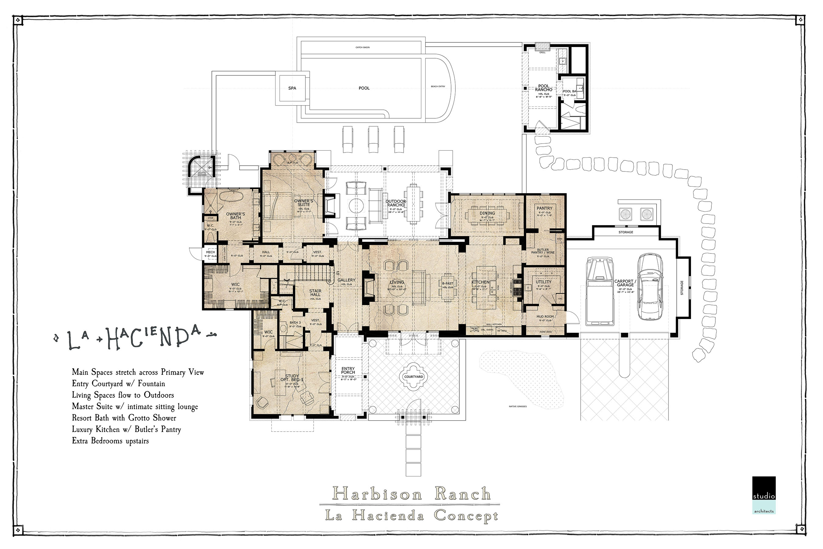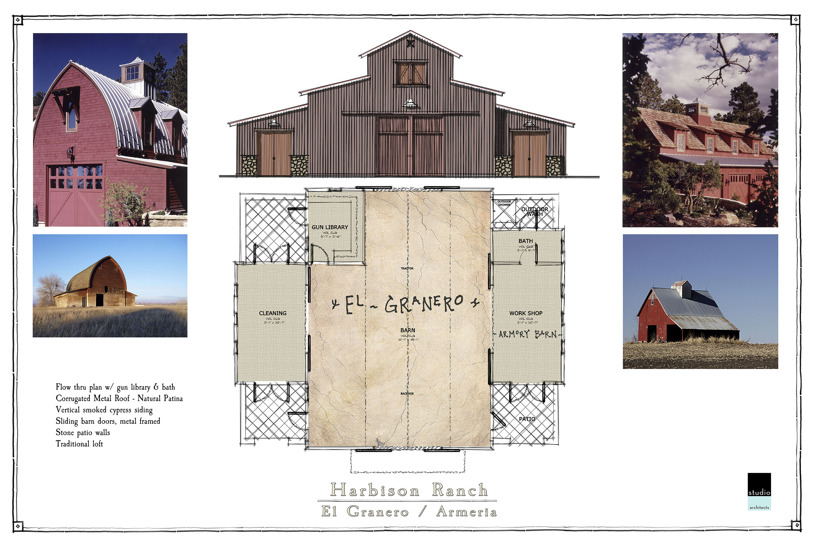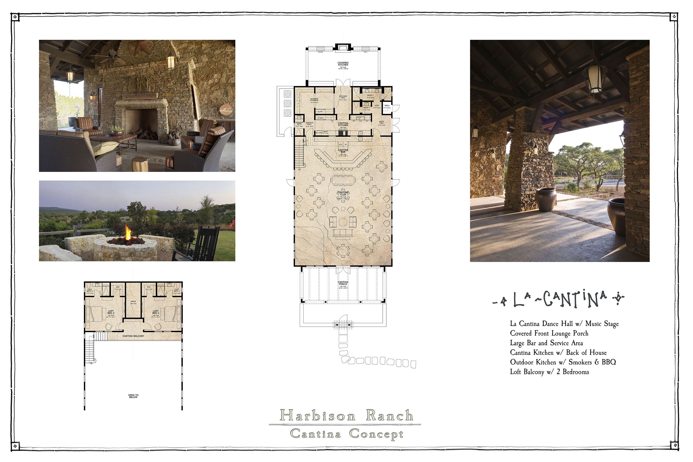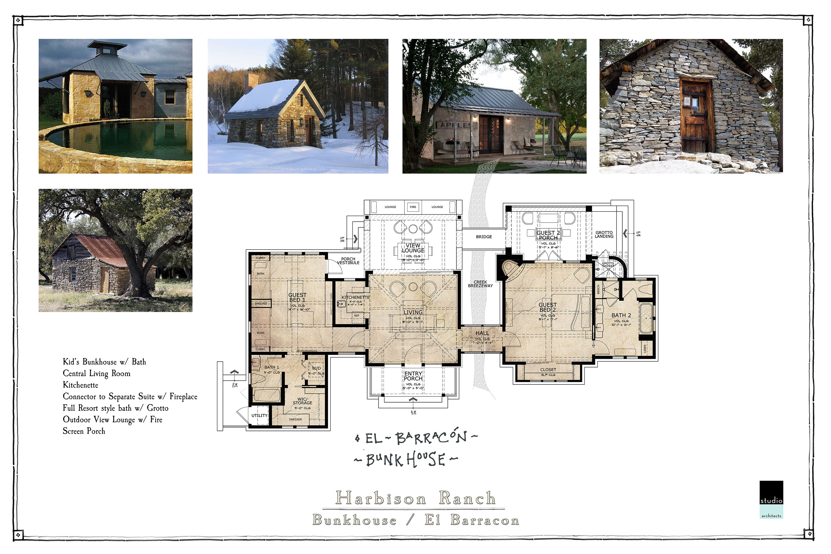 The natural hilltop of a large ranch property provides spectacular views of the Hill Country and the perfect site for this family retreat. The Main Ranch House “La Hacienda”, Guest Cabins “Bunkhouses”, and Worker’s Quarters comprise the center of the estate while the entertainment Pavilion “La Cantina” sits behind the functioning Barn and Armory. Traditional architectural building forms and locally sourced materials reinforce the authentic character of this family heirloom estate.