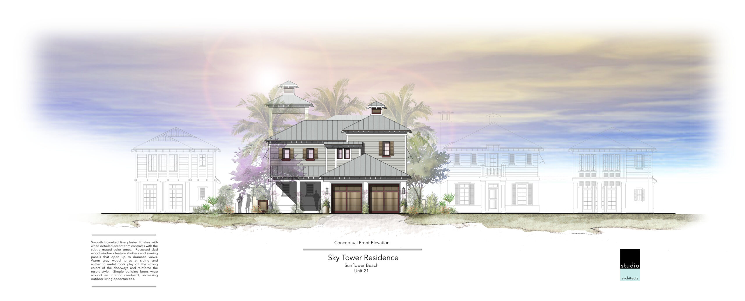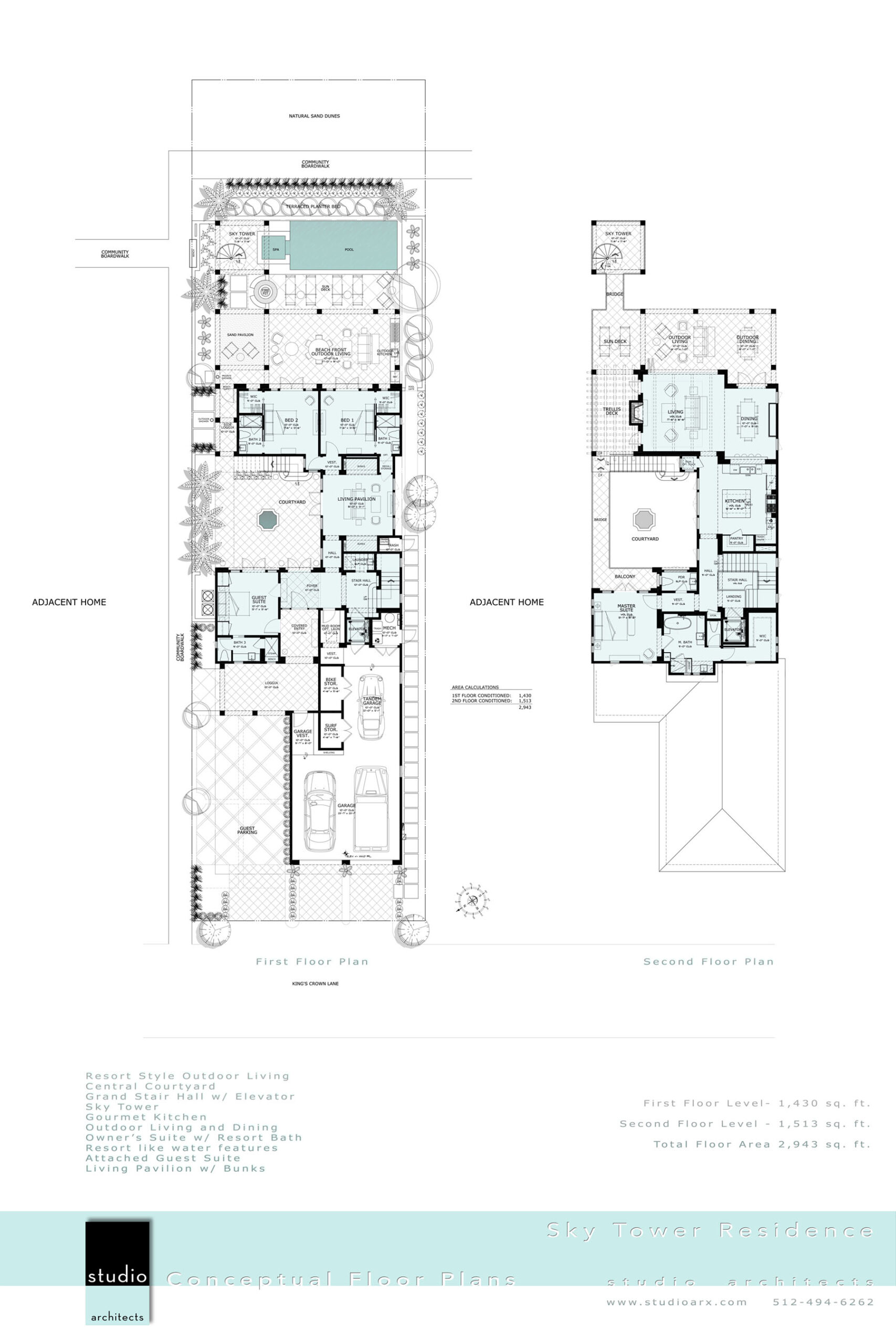 Open courtyard style plan configured to fit on tight lot